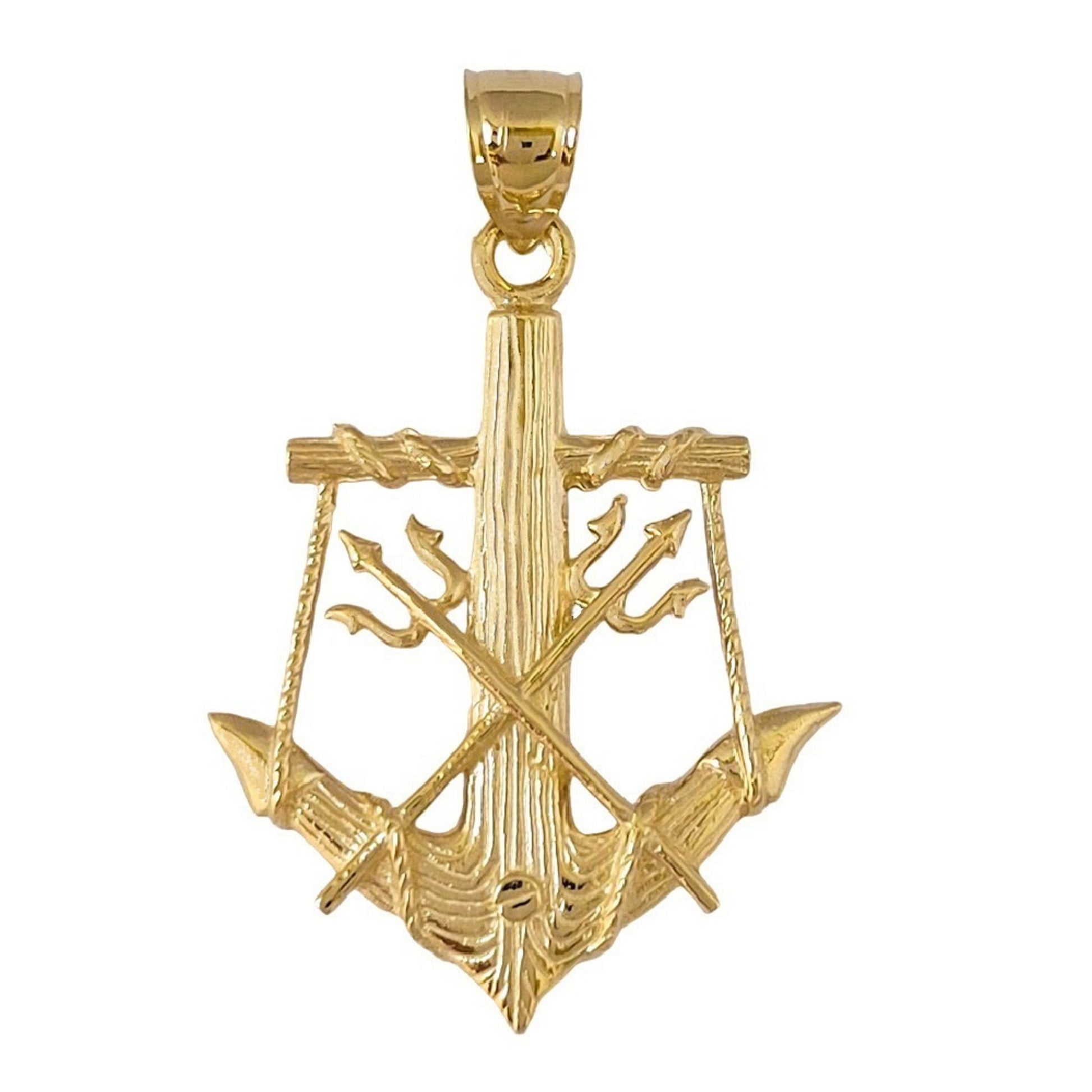 14K Yellow Gold Anchor with Trident 3D (3 Dimensional) Solid Pendant.